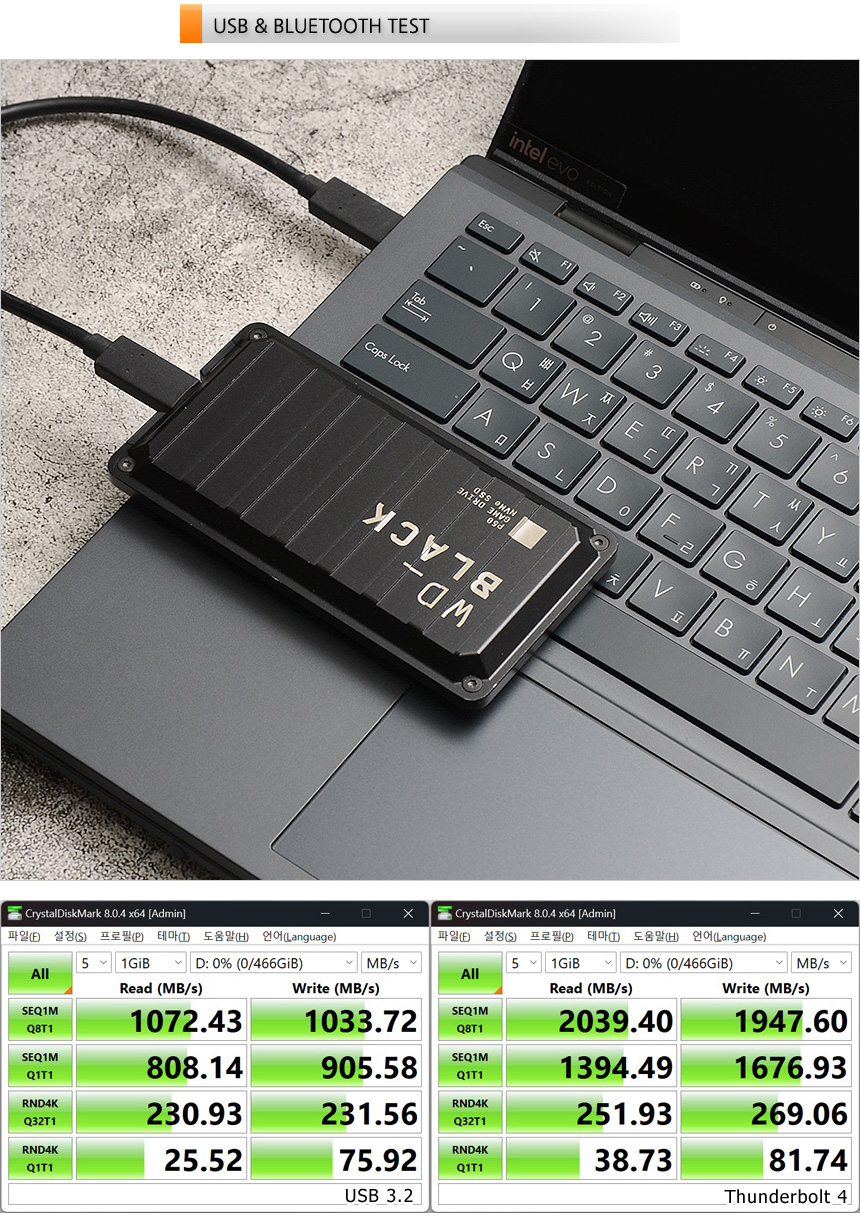 썬더볼트 4 단자를 지원해 빠른 데이터 전송이 가능하다. 상단의 사진은 외장 SSD (USB 3.2 Gen2x2 지원모델) 를 이용해 테스트를 진행하고 있는 모습으로 일반 노트북을 압도하는 빠른 속도를 보여주었다. @ 공식 스펙에는 A타입의 USB 단자가 USB 3.2 Gen1을 지원한다고 나와 있지만 테스트에서는 USB 3.2 Gen2 의 속도를 보여주었다.