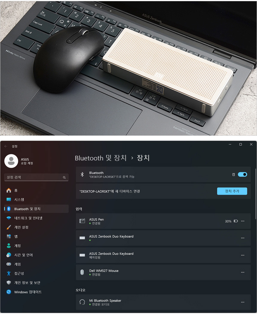 블루투스를 지원해 무선으로 주변기기를 연결할 수 있다. 상단의 사진은 마우스와 스피커의 연결 테스트를 진행하고 있는 모습으로 문제없이 작동되는 것을 확인할 수 있다. (인텔의 고급형 무선랜카드를 사용해 기기 검색 및 연결속도가 상당히 빠르다.)
