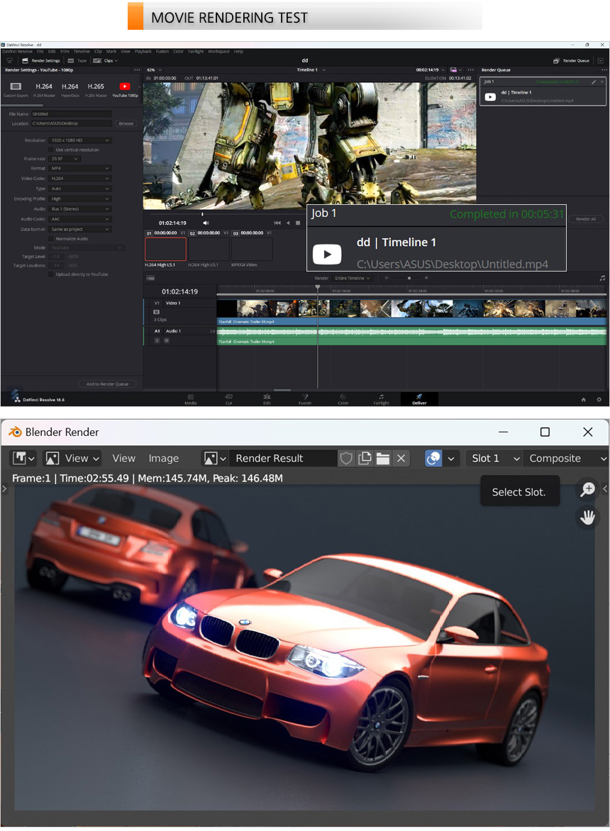 영상편집 S/W 다빈치 리졸브를 이용해 랜더링 테스트를 진행하고 있는 모습으로 (640MB, 920MB, 990MB 4K 동영상을 단일 동영상으로 랜더링, FHD 해상도에 H.264 비디오 코덱) 05분 31초가 소요되는 것을 확인할 수 있었다. 또한 블랜더 랜더링 테스트 에서는 2분 55초가 소요되었다. (구형 게이밍 노트북 수준의 성능을 보여주었다. 크리에이터 용도로 충분히 사용할 수 있는 노트북이다.)