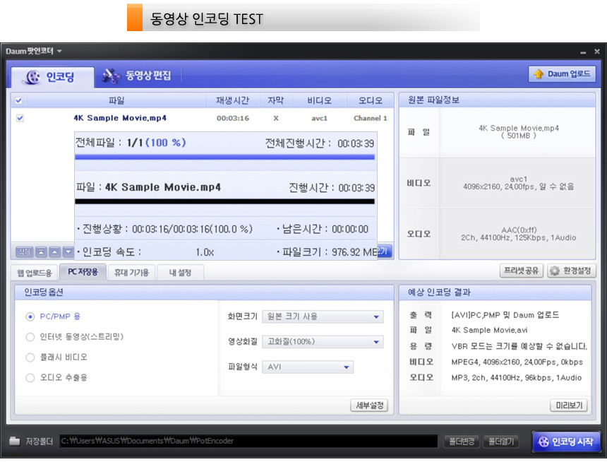 4K 동영상을 이용해 인코딩 테스트를 진행하고 있는 모습으로 3분 39초의 빠른 인코딩 속도를 보여주었다.