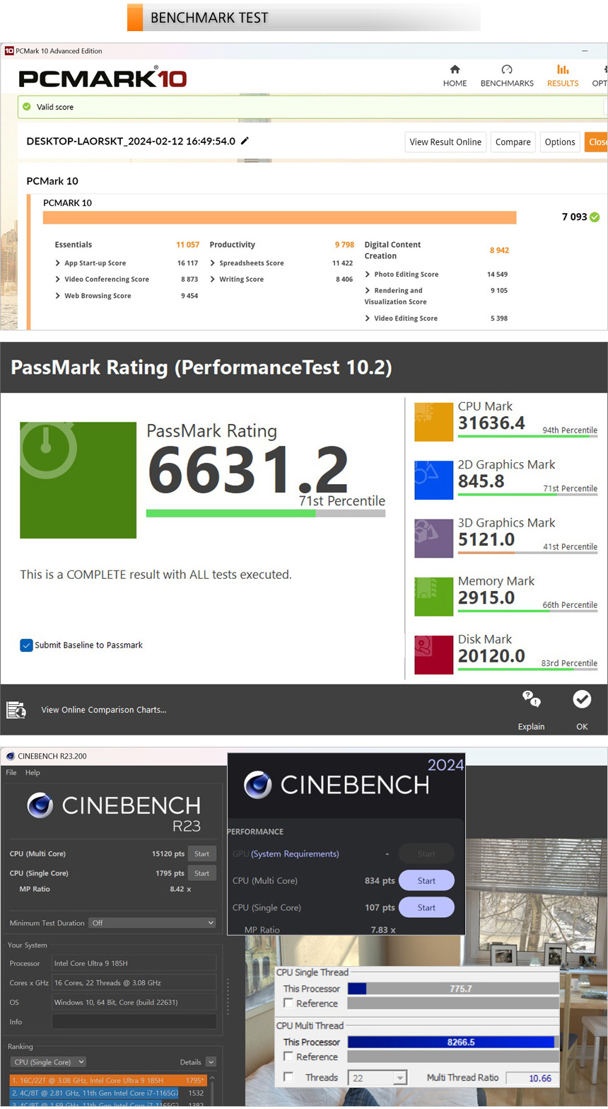 벤치마크 프로그램을 통해 기기의 성능을 확인하고 있는 모습으로 기존에 테스트 했던 울트라 5나 7과는 비교되는 높은 CPU 스코어를 보여주었다. 32GB 메모리가 장착된 노트북으로 대부분의 작업을 부드럽게 실행할 수 있을 것이다.