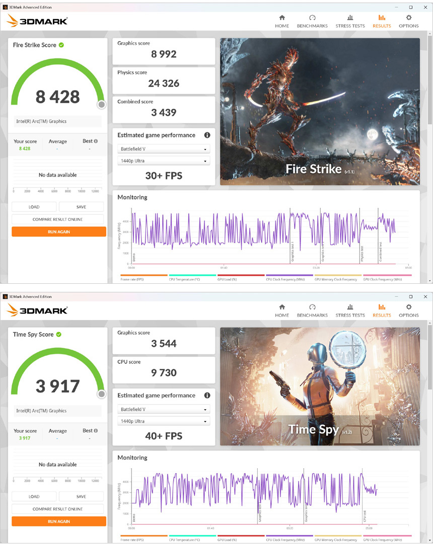 오버워치 2 프레임 테스트 하고 있는 모습으로 113-183 프레임으로 플레이 되는 것을 확인할 수 있었다. 120Hz 주사율 특유의 부드러움 영상을 즐길 수 있을 것이다. @ 기존에 테스트 했던 울트라 7 155H 탑재 젠북과 3DMARK 스코어는 거의 동일했다. 하지만 실제 게임 테스트에서는 큰 성능차를 보여주었다.