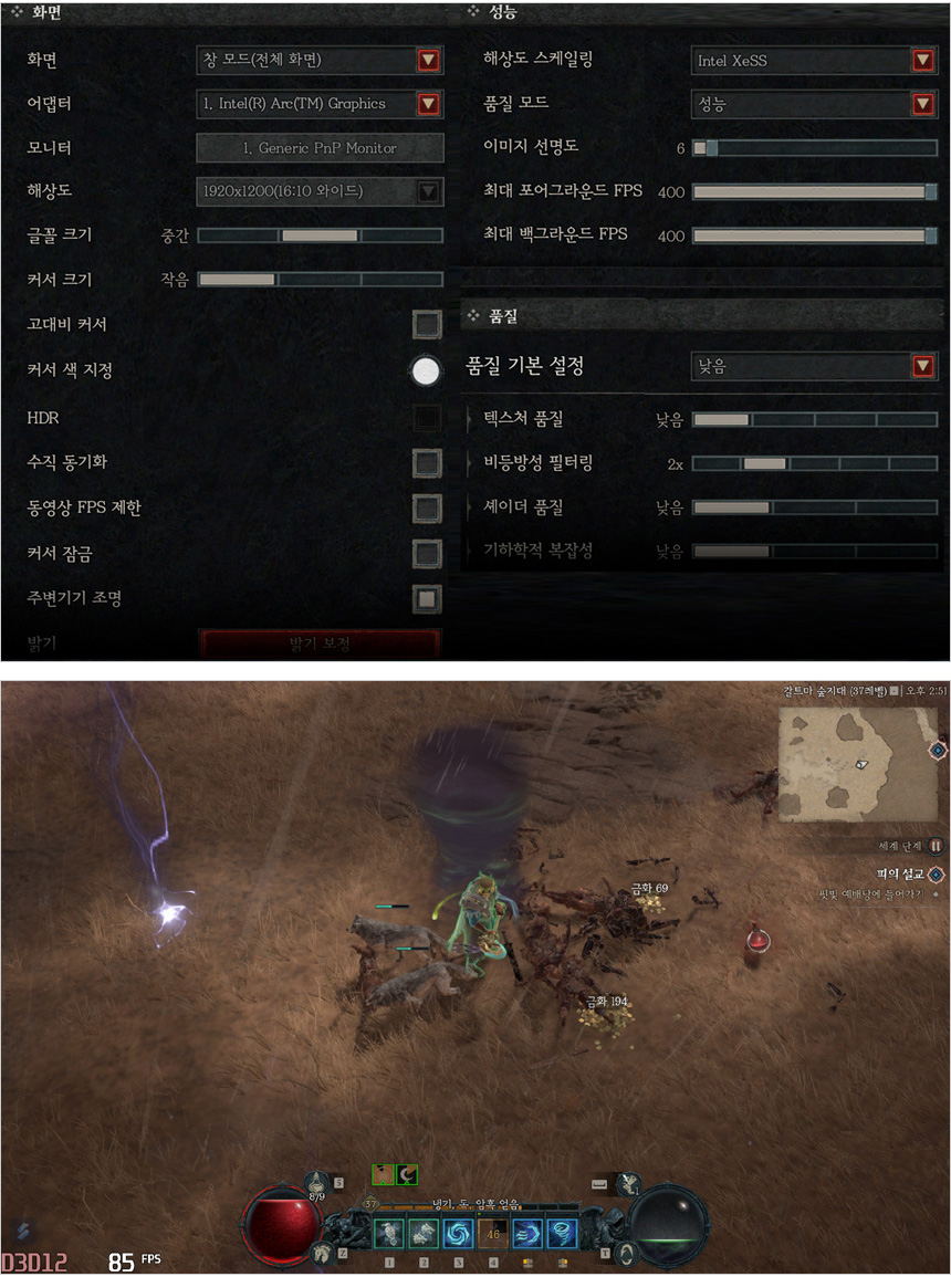 디아블로 4를 낮음 옵션에서 실행하고 있는 모습으로 노멀 상태에서는 50-71 정도의 프레임을 보여 주었으며 인텔 XESS_성능 으로 설정하고 테스트 했을 때 에는 70-89 프레임으로 게임을 플레이 할 수 있었다. @ 프레임 보정 기술인 XESS를 사용하면 횔씬 쾌적하게 플레이 할 수 있다. 꼭 XESS를 켜놓고 게임을 즐기기 바란다.