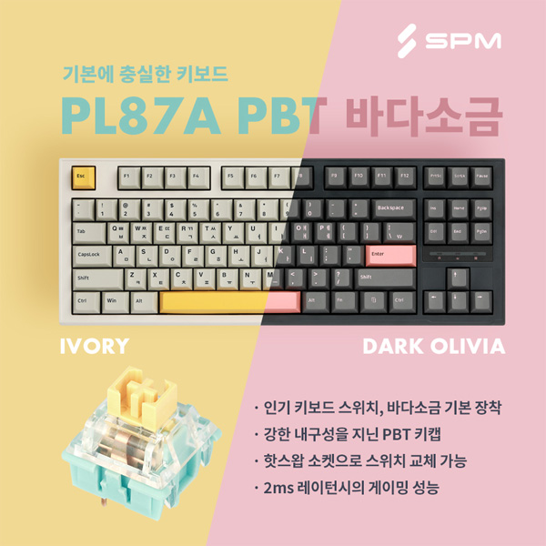 SPM PL87A 키보드는 이러한 키보드 시장에서 커스텀의 느낌을 기성품에 담아낸 키보드로, 커스텀 키보드 사용자들에게 입문용으로 가장 사랑받은 하이무 바다소금 스위치를 기본 장착하고 있으며, 실리콘 패드와 포론 패드, EPDM-A80 스펀지 등 고품질의 흡음재로 타건 시 울림과 잡소리를 최소화한다. 또한, 탄성있는 실리콘 패드를 통해 부드러운 타건감을 느낄 수 있다.
