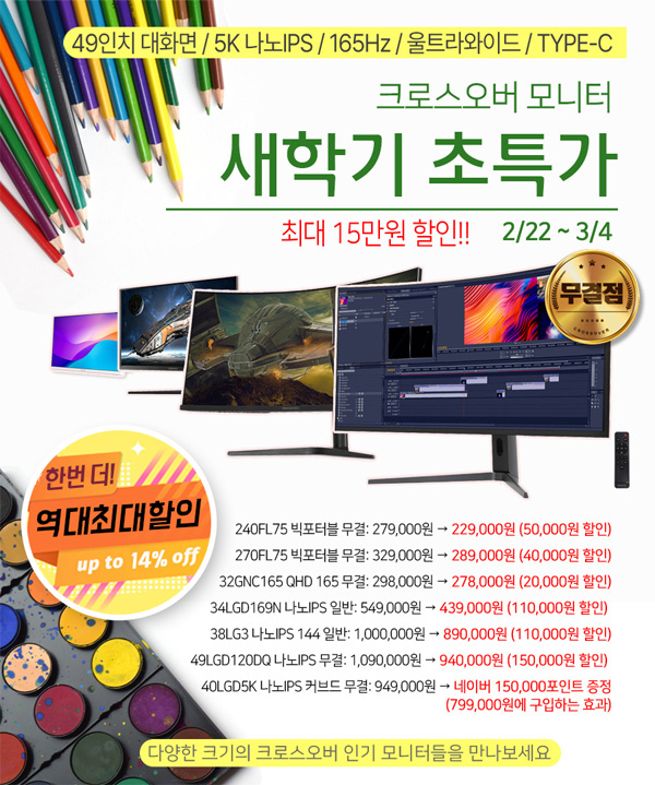 이번 행사동안 크로스오버의 빅포터블, 24, 27, 32, 34, 38, 40, 49형 등 다양한 모니터를 구입하면 최대 150,000원 파격할인을 실시한다. 행사기간은 2월 22일 목요일부터 3월 4일 월요일까지 총 12일간 진행되며, 여기에 포토상품평 이벤트도 진행돼 간단하게 상품평을 작성하고 상품권도 받을 수 있다.