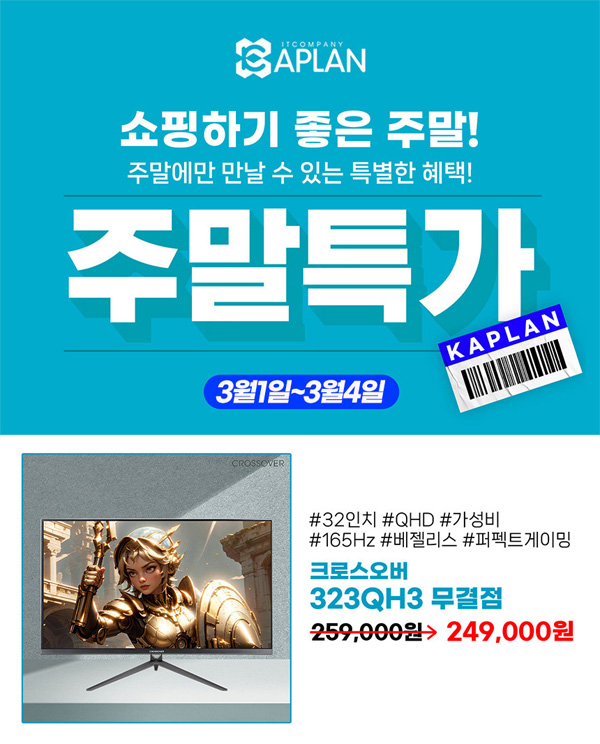 크로스오버는 32인치 고해상도 게이밍 모니터 ‘323QH3 GAMING 165 HDR 평면 PLUS’를 대상으로 주말 이벤트를 실시한다.?