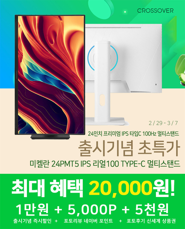 크로스오버가 24형 FHD 100Hz를 지원하는 프리미엄 모니터 ‘미켈란 24PMT5 IPS 리얼100 TYPE-C 멀티스탠드’ 출시를 기념하기 위해 특가 이벤트를 진행한다.