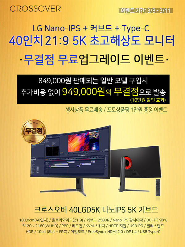 크로스오버가 40형 5K 초고해상도 커브드 모니터 ‘40LGD5K 나노IPS 5K 커브드’를 대상으로 네이버 주말특가를 진행한다.