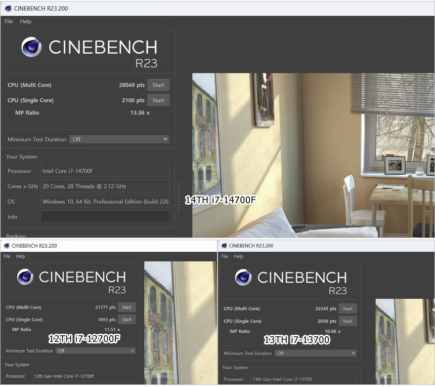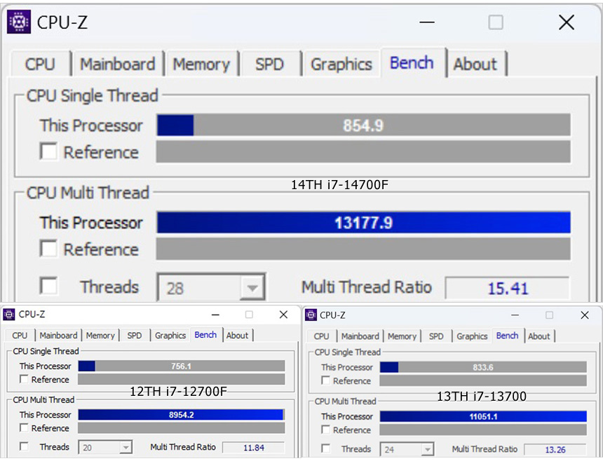 가장 먼저 직관적으로 CPU 성능을 확인할 수 있는 CPU-Z를 이용해 전작들과 성능을 비교한 모습으로 13세대와 분명한 스코어 차이를 보여주었다. 높아진 클럭과 늘어난 코어 & 캐시 용량만큼 성능이 높아졌다고 이해하면 될 것이다.