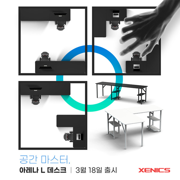제닉스는 지속적으로 고객의 니즈에 맞는 컴퓨터퍼니처와 기어류를 선보였는데 이번 아레나L데스크는 다양한 환경에 맞춰 사용할 수 있는 제품으로 일자타입(양방향), L자타입(좌,우) 변형으로 좁은 공간부터 넓은 공간까지?최적의 환경으로 책상을 배치할 수 있는 제품이다.