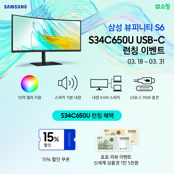 또한 삼성 뷰피니티 S6 S34C650U 런칭 프로모션도 진행한다. 행사 기간은 2024년 3월 18일~3월 31일이며, 15% 중복할인과 포토 리뷰 이벤트도 같이 진행한다 .