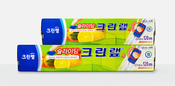 ‘슬라이딩 크린랩‘은 톱날 대신 손 다칠 걱정 없는 슬라이딩 커터로 누구나 쉽게 랩을 자를 수 있는 식품 포장 랩이다. 한 손으로도 편리하게 사용 가능하며, 일자로 커팅되어 깔끔한 포장이 가능하다. 국제 공인 검사기관인 SGS(Societe Generale de Surveillance)의 종합 검사를 받아 까다로운 유럽의 안전 인증도 통과했다.