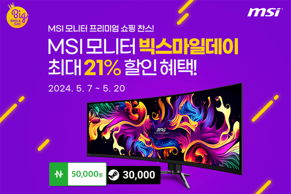한편, MSI는 할인 혜택과 더불어 제품에 따라 최대 50,000원 네이버 페이 증정의 포토리뷰 이벤트와 QD-OLED 제품 한정으로 진행되는 10만원 스팀코드 이벤트,게이밍 모니터 대상의 3만원 스팀코드 이벤트 등 추가 혜택의 기회도 제공하여 행사혜택을 더욱 극대화시켰다.