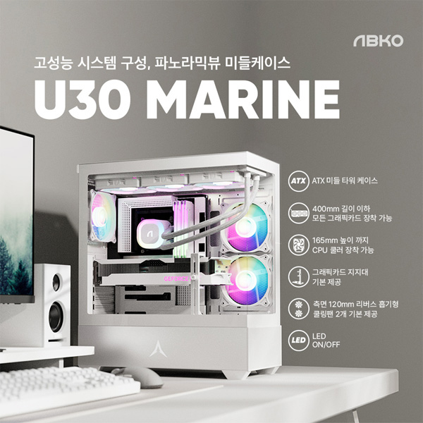 높은 시스템 호환성, U30 마린 이번 5월 16일 앱코에서 새롭게 출시한 U30 마린 케이스는, 전면 및 측면 패널이 강화유리로 이루어져 있는 파노라믹 뷰를 기본 베이스로 하여, 상단 최대 360mm 수랭 쿨러부터, 최대 165mm의 듀얼 공랭쿨러, 400mm 길이 이하 모든 그래픽카드가 장착 가능한 높은 호환성의 ATX 미들타워 어항 케이스이다. 또한 0.8T 이상의 튼튼한 섀시를 바탕으로, 고성능 그래픽카드의 무거운 무게를 지탱해줄 수 있는 그래픽카드 지지대까지 기본 제공하여, 내부 부품들을 섀시 휘어짐 없이 튼튼하게 보호하여 준다.