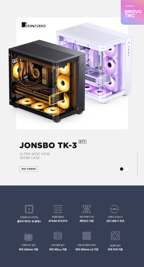 브라보텍에서 전면과 측면 강화유리 패널이 끊김없이 곡면으로 이어지는 미려한 디자인의 울트라 와이드 뷰 튜닝 케이스 JONSBO TK-3 BTF 모델을 출시한다.