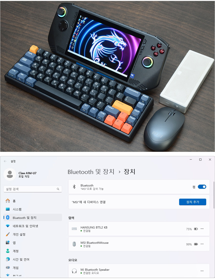 쉽게 제품의 크기를 예측할 수 있도록 많은 유저들이 사용하고 있는 닌텐도 스위치와 비교한 모습이다. (닌텐도 스위치가 작고 가벼워 편하게 들수 있지만 그립감이나 조작감은 MSI 클로가 훨씬 뛰어났다.)