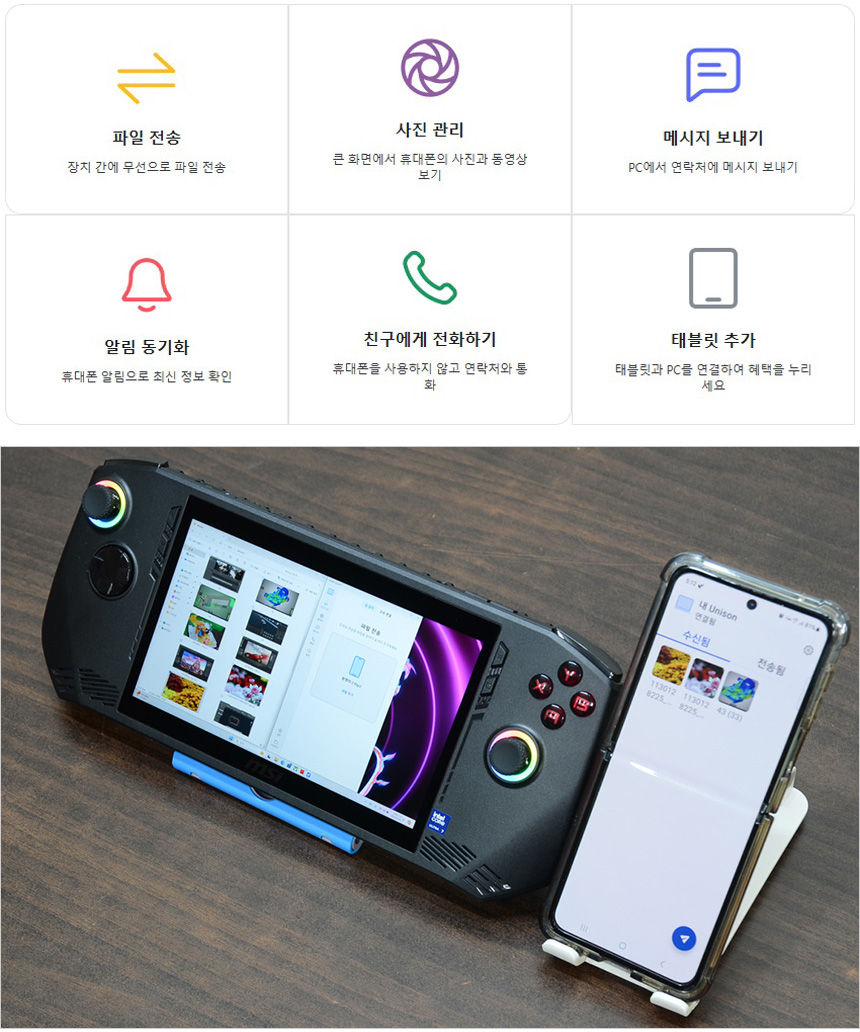 인텔 유니슨을 사용하면 기기에서 전화를 걸거나 문자 등을 전송할 수 있다. 또한 파일전송 기능을 제공해 사진과 같이 상호간 파일전송이 가능하다.