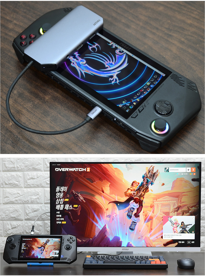 뿐만 아니라 대화면 디스플레이 연결이 가능해 노트북이나 PC처럼 활용도 가능하다. 발로란트나 LOL, 오버워치 등은 옵션 조정시 100 프레임 이상을 충분히 확보할 수 있는 성능을 가지고 있어 사진과 같이 대화면 게이밍 모니터에 연결하고 키보드나 마우스 등을 사용하면 (멀티허브를 통한 유선 연결이나 블루투스 무선연결) 박진감 넘치는 게임 플레이가 가능하다.