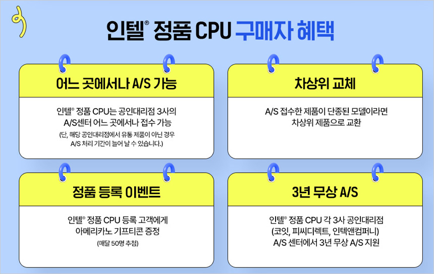 다양한 구매 혜택을 제공하는 것도 인텔 정품 CPU 구입의 큰 장점이라 할 수 있다. 통합 A/S 센터를 운영하던 예전과 달리 신속한 처리를 위해 유통사 A/S 로 전환 했는데 구입제품의 유통사를 모르거나 잘못 찾아가는 등의 불편이 있었다. 인텔에서는 이런 불편을 최소화 하고자 3사 A/S 센터 어디서나 서비스를 받을 수 있도록 했다. 사용자는 제품에 문제가 생겼을 경우 3개의 서비스 센터중 하나만 알아도 되는 것이다. 단, 해당 유통사 모델이 아닐 경우 다소 처리시간이 길어질 수는 있다는 점 참고 바란다.