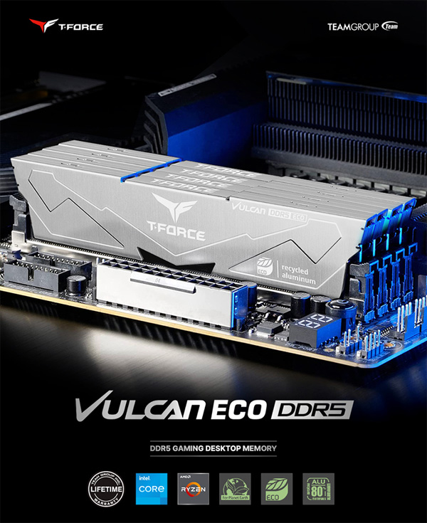 팀그룹 벌칸 에코 시리즈의 가장 큰 특징은 재생 알루미늄을 이용해 히트싱크를 제작했다는 점이다. 환경 보호를 통한 지속 가능한 미래, 탄소 배출 감소를 위한 취지로 제작된 모델이기 때문에 제품명에 ‘에코’가 포함되었다. 히트싱크의 약 80%가 재활용 알루미늄 소재로 사용된 벌칸 에코 시리즈는 제품 1개당 정상적인 방법으로 정제된 알루미늄 대비 약 73% 가량의 탄소 절감 효과를 가지며, 이는 1,000개의 제품을 지속적으로 생산할 경우 비닐 봉투 2만 9천장, 플라스틱 빨대 31만 2천 3백개, 페이퍼 타월 55만 2천 5백개, PET병 1만 6천 3백개 분량에 달하는 탄소 절감 효과를 실현할 수 있게 된다.