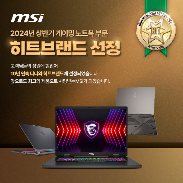 올해로 노트북 출시 20주년을 맞은 글로벌 PC 하드웨어 브랜드 MSI는 우수한 품질과 업계 최고 수준의 기술력, 최상의 성능을 갖춘 노트북으로 가격 비교 사이트 다나와에서 주최한 2024년 상반기 히트브랜드 게이밍 노트북 부문에서 매출, 판매량, 고객 만족도 등을 평가 지표로 소비자에게 가장 사랑받는 브랜드로 선정되었다.