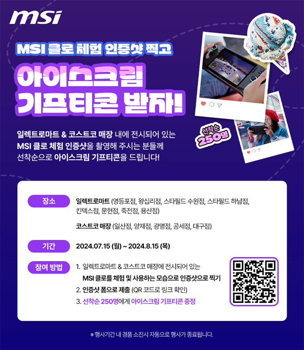 이벤트는 2024년 7월 15일부터 8월 15일까지 한 달간 진행되며, 선착순 250명에게 아이스크림 기프티콘을 증정한다. MSI '클로 A1M-U7'는 일렉트로마트(영등포점, 왕십리점, 스타필드 수원점, 스타필드 하남점, 킨텍스점, 문현점, 죽전점, 용산점)와 코스트코 매장(일산점, 양재점, 광명점, 공세점, 대구점)에 전시되어 있다.