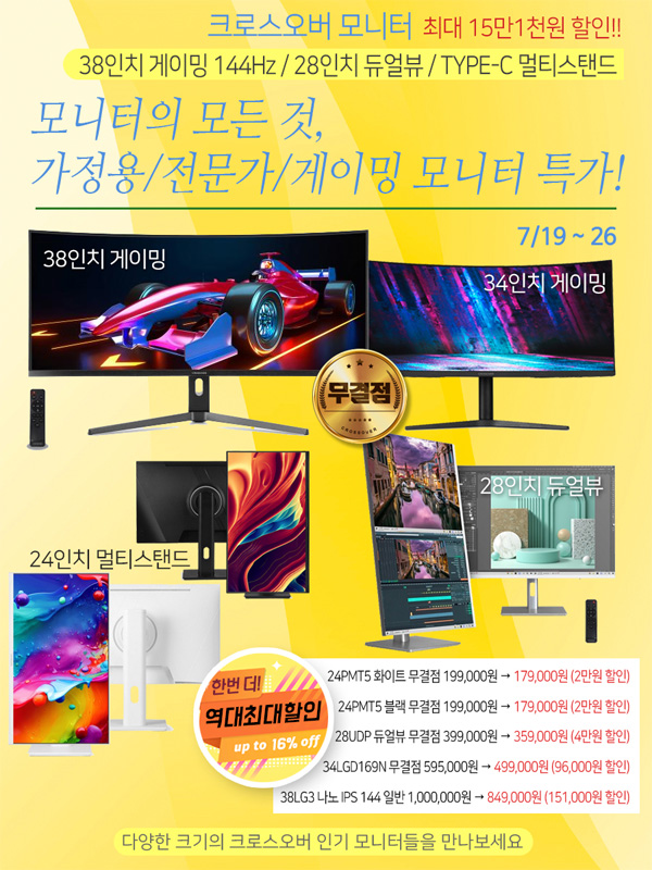 크로스오버는 자사의 인기 게이밍, 고해상도 모니터들을 대상으로 “모니터의 모든 것, 가정용, 전문가용, 게임용 모니터 특가!” 이벤트를 펼친다.