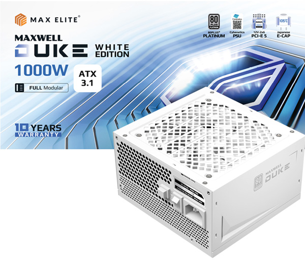 맥스엘리트는 80PLUS PLATINUM 고효율 인증과 인텔 ATX 3.1 및 PCIe 5 그래픽카드를 지원하는 맥스엘리트 MAXWELL DUKE 1000W / 1300W 80PLUS PLATINUM 풀 모듈러 ATX 3.1 (PCIE5) 화이트를 출시한다고 밝혔다.