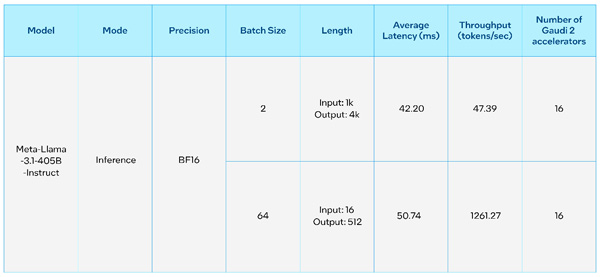 인텔® 가우디®(Intel® Gaudi®) 및 인텔® 제온®(Intel® Xeon®), 인텔® 코어™ Ultra(Intel® Core™ Ultra) 프로세서 및 인텔® 아크™(Intel® Arc™) 그래픽이 탑재된 AI PC를 포함해 인텔 AI 제품 포트폴리오 상에서의 라마 3.1 모델 초기 성능 측정 결과는 다음과 같다.