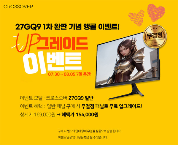 크로스오버가 27형 고해상도 모니터 ‘27GQ9 IPS QHD 크로스기어’ 완판을 기념하기 위해 추가로 무결점 무료 업그레이드를 진행한다고 밝혔다.