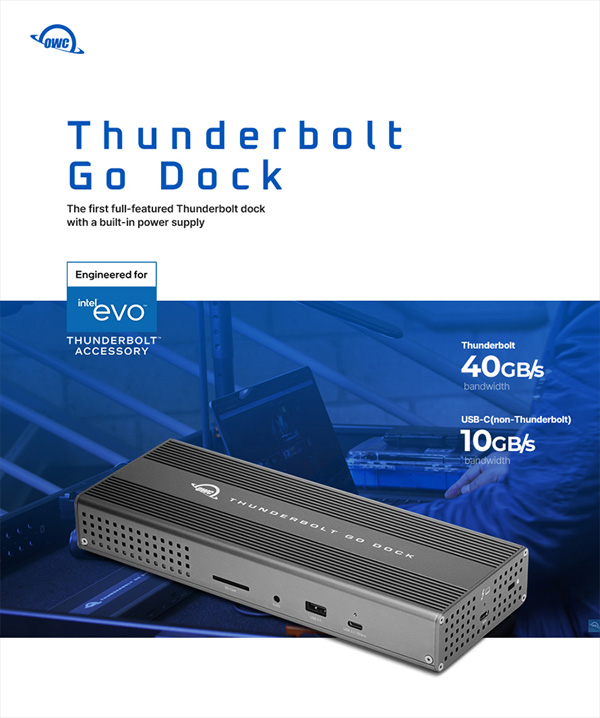 OWC 또 다른 신제품인 썬더볼트4 고 독은 90W 전력 출력의 썬더볼트 4 1개 포트를 시작으로 2개의 썬더볼트 4 포트, 4K 해상도 출력이 가능한 1개의 HDMI 2.1 포트, 2.5 기가비트의 이더넷 포트, 2개의 USB 3.2 포트와 1개의 USB 2.0 포트, 1개의 HD오디오용 3.5mm 커넥터와 SD카드용 포트 1개를 포함, 총 10개의 포트를 통한 연결성을 갖추고 있다.
