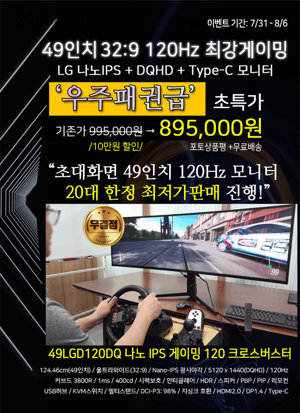 크로스오버가 49형 초 대화면 커브드 게이밍 모니터 ‘49LGD120DQ 나노 IPS 게이밍 120 크로스버스터’를 대상으로 우주 패권급 모니터 할인 이벤트를 진행한다고 밝혔다.