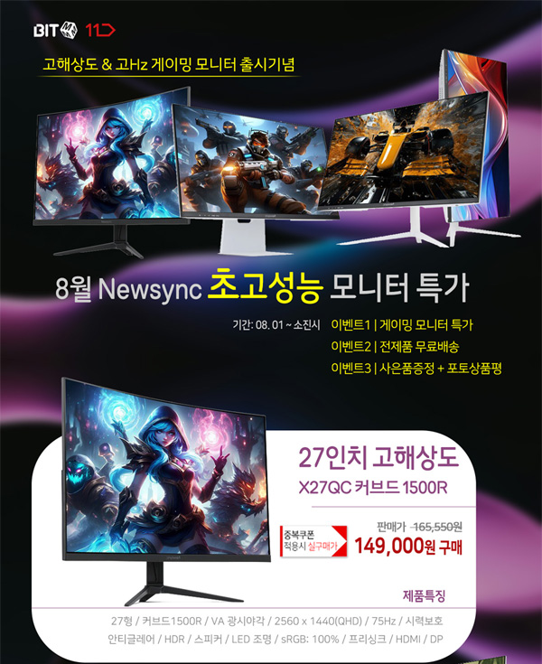 비트엠은 11번가를 대상으로 8월 고해상도 &고Hz 게이밍 모니터 신제품 출시 기획전을 실시한다.