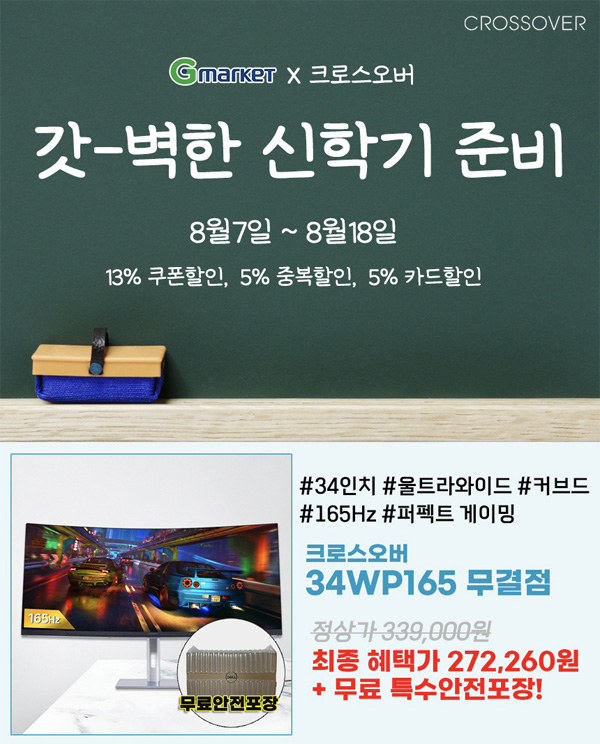 크로스오버가 34형 커브드 게이밍 모니터 ‘34WP165 커브드 리얼 165 울트라와이드 멀티스탠드 무결점’ G마켓 갓-벽한 신학기 준비 이벤트를 진행한다.