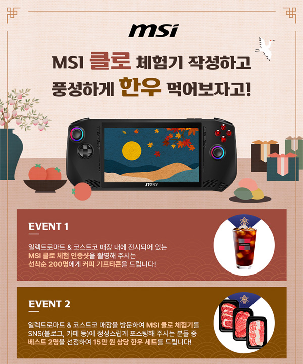 이벤트는 2024년 8월 16일부터 9월 22일까지 진행되며, 체험기 작성 베스트 2인에게는 15만 원 상당의 한우 세트를, 인증샷 선착순 200명에게는 커피 기프티콘을 증정한다. MSI '클로 A1M-U7'는 일렉트로마트(영등포점, 왕십리점, 스타필드 수원점, 스타필드 하남점, 킨텍스점, 문현점, 죽전점, 용산점)와 코스트코 매장(일산점, 양재점, 광명점, 공세점, 대구점)에 전시되어 있다.