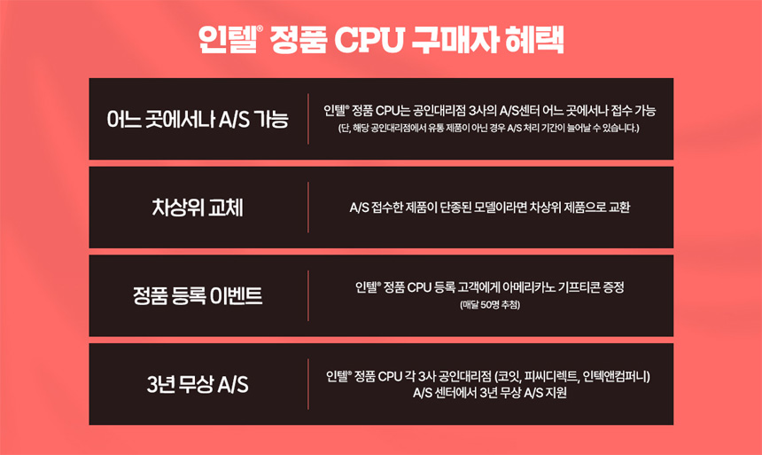 마지막으로 정품등록 이벤트를 상시 진행해 구매자들에게 다양한 혜택을 제공하고 있다. 정품 CPU 등록자중 매달 50명을 추첨해 아메리카노 기프트콘 증정 행사를 진행해 당첨되면 기본좋게 아메리카노를 즐길 수 있다.