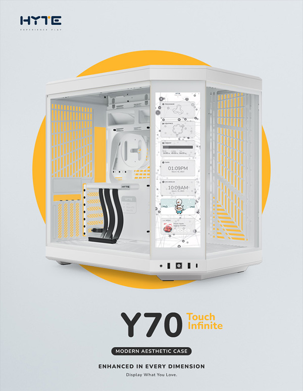 하이트의 인기 PC케이스, Y70의 파생 모델인 Y70 터치 인피니트는 전작인 Y70 터치의 공식 후속 모델이다. 전면과 측면이 이어지는 위치에 디스플레이가 적용된 외형 자체는 전작과 동일하나 이 디스플레이의 크기를 키워 베젤이 더 얇아지고 세부 스펙을 향상시켰다.