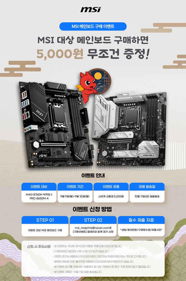 첫 번째 이벤트는 MAG B760M 박격포 II 혹은 PRO 650M-A 구매자 전원에게 5,000원 상당의 신세계 상품권을 증정하는 이벤트다. 구매를 인증할 수 있는 필수 자료만 제출하면 간단하게 참여가 가능하다. 이벤트 진행 기간은 2024년 9월 9일(월)부터 9월 30일(월)까지다.