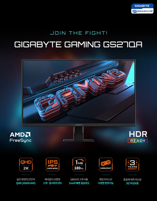 이외에도 ‘GIGABYTE 게이밍 GS27QA 180 HDR’은 게임 편의 기능인 'Game Assist'와 오랜 시간 편안한 게이밍을 위한 로우 블루라이트, 플리커 프리 기술등을 기본적으로 제공하며, 3년 무상의 A/S 보증 서비스를 통해 오랜 기간 동안 사후 관리를 받을 수 있는 장점이 있다.