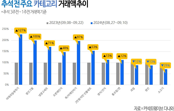 추석을 앞두고 주방가전 시장에선 비교적 저렴한 제품의 거래액이 눈에 띄게 증가했다. 발효기와 과일세척기, 생선그릴의 거래액이 각각 226%, 127%, 100% 증가했다. 반면 전기압력밥솥은 17% 감소했다. 건강가전 시장에선 목/어깨안마기의 거래액이 97% 급증했으며, 상대적으로 고가인 안마의자의 거래액은 6% 감소했다.
