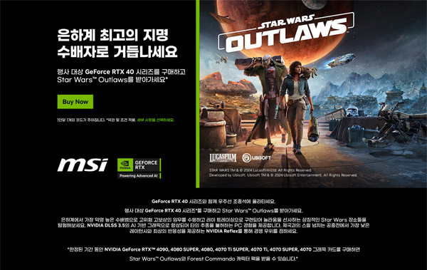 MSI는 ‘MSI 지포스 RTX™ 40 시리즈’ 그래픽카드 구매자들에게 ‘스타워즈 아웃로’ 게임을 증정하는 행사를 연장 진행한다고 밝혔다.