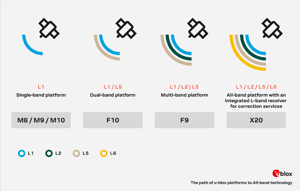 X20은 L-밴드 수신기를 통합한 전 대역(L1/L2/L5/L6) 플랫폼이다. 가용한 모든 GNSS 위성 신호를 지원하므로 신호 환경이 까다로운 곳에서도 최고 정밀도의 위치 추적을 제공한다. 신제품은 기본 L1 및 L2 주파수와 함께, 이후에 추가된 L5 대역도 지원한다. L5 대역은 L1 및 L2 대역보다 낮은 주파수에서 작동하며 향상된 신호 특성의 이점도 누릴 수 있어, L5 신호를 본질적으로 더 견고하게 해준다. 유블럭스 X20은 L6 대역도 추가로 지원하며 이 대역은 내비게이션 서비스뿐만 아니라 위치 추정을 더욱 정밀하게 하는 보정 서비스에도 사용된다.?