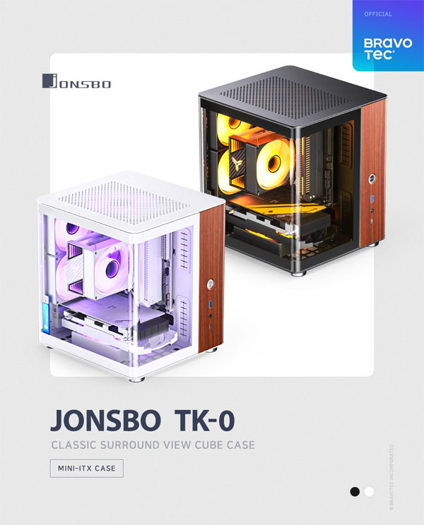 JONSBO TK-0 모델은 화이트/블랙 컬러의 고품질 알루미늄 패널과 북미산 호두나무 원목 패널이 적용되어 미려한 클래식 디자인이 돋보이며 전면, 측면, 후면까지 이어지는 서라운드 뷰 곡면 글래스 패널로 압도적인 튜닝 효과를 제공하는 것이 특징이다.?PCI 슬롯을 깔끔하게 커버하는 미려한 디자인의 알루미늄 네임플레이트 제공 및 가로/세로 방향의 자유로운 케이스 배치로 다양한 데스크 환경에서 탁월한 심미성과 편의성을 제공한다.