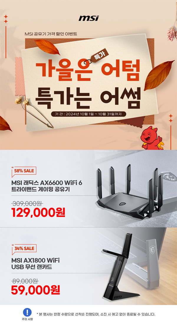 MSI는 MSI 네트워크 제품군에 대한 특가 프로모션을 진행한다고 밝혔다. 이번 특가는 2024년 10월 1일부터 10월 31일까지 진행되며, 한정 수량을 판매하기 때문에 재고 소진 시 자동으로 종료된다.