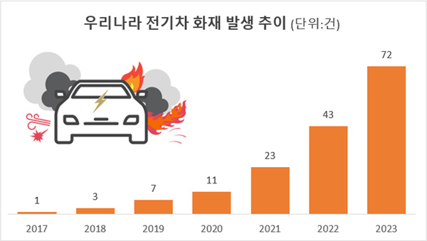 전기차 보급이 확대됨에 따라 전기차 화재 사고도 늘어나고 있다. 소방청에 따르면 전기차 화재는 해마다 2배가량 증가해 2023년에는 72건을 기록했다. 이런 추세가 유지될 경우 올해에는 100건을 넘길 것으로 전망된다. 전기차 화재를 더 이상 남의 일로 볼 수 없는 이유다.