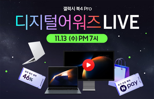 유니씨앤씨는 고성능 인텔 코어 울트라 프로세서와 WQXGA+ Dynamic AMOLED 2X 터치스크린을 탑재한 삼성 갤럭시북4 프로 / 프로360 / 울트라와 올인원 프로 대상으로 한정 쿠폰 할인 포함, 최대 119만원 할인 혜택과, 12개월 무이자 할부 혜택, 갤럭시 바꿔보상, SSD 더블업 특가, 무선 키보드&마우스, 한컴 오피스 등 푸짐한 사은품이 증정되는 ‘디지털어워즈’ 라이브 방송을 2024년 11월 13일 19시부터 1시간 동안 네이버 스마트스토어를 통하여 진행한다.