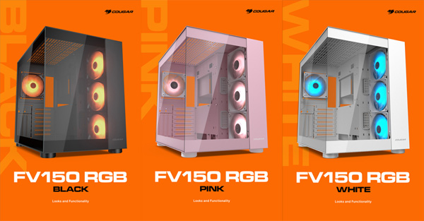 쿠거 FV150 RGB는 듀얼 챔버 디자인이 적용된 ‘어항형’ PC케이스 모델이다. FV 시리즈는 앞서 유선형으로 제작된 FV270 시리즈가 출시된 바 있으며, 이번 FV150 RGB는 직사각형의 큐브 형태로 제작된 미들타워 규격으로 출시되었다. FV150 RGB는 PC하드웨어를 쇼케이스 형태로 구현한 PC케이스 컨셉에 따라 존 단위 빌드 공간 분할을 지원한다. 따라서 저장장치나 파워서플라이와 같은 직접적인 튜닝 효과가 없는 하드웨어와 메인보드, CPU쿨러, VGA와 같은 제품들이 서로 다른 영역에 설치되며, 전면과 측면 강화유리 패널이 맞닿는 부분의 코너 필러를 제거해 구조에 따른 개방감 극대화를 지원한다.