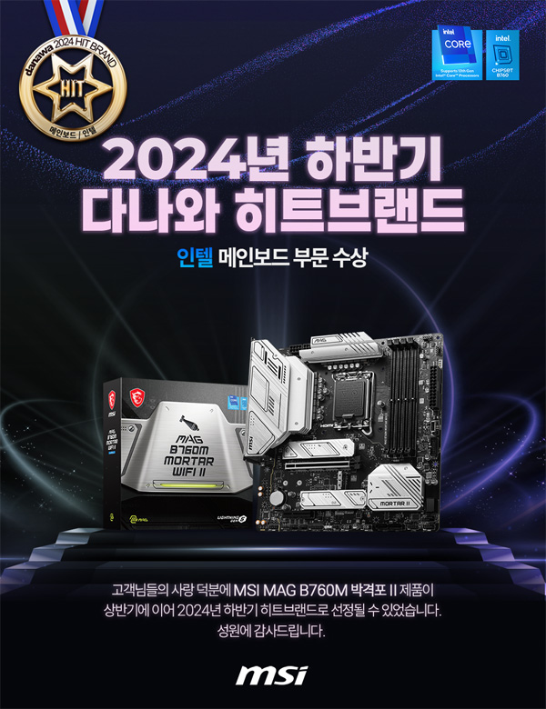 금번 다나와 히트브랜드 메인보드/인텔 부문에 선정된 MSI의 MSI MAG B760M 박격포 II는 몇 년간 꾸준한 인기를 얻어온 ‘국민 메인보드’로 넓은 인지도를 갖고 있는 제품이다.??MSI MAG B760M 박격포 II는 Dr.MOS 방식의 12개의 Vcore 전원부, 총 900A의 넉넉한 전원부 용량, 3개의 M.2 NVMe 슬롯 구성, 최대 7,800 MHz+의 메모리 클록 지원, 20 Gbps 대역폭의 후면 USB-C 포트 제공으로 가성비 있게 탄탄한 메인보드를 이용하고 싶은 소비자들의 수요를 충족했다.