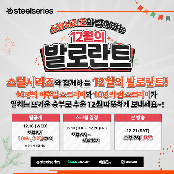 스틸시리즈와 치지직 스트리머 네클릿이 주최하는 ‘12월의 발로란트’ 대회는 12월 18일(수) 팀을 발표했으며, 12월 21일 (토) 19시에 진행된다. 전 경기는 네이버 치지직을 통해 시청할 수 있다.?이번 대회는 10명의 버추얼 크리에이터 그룹과 10명의 캠 크리에이터 그룹으로 구성된 총 20명의 초보 게이머 참가자들이 ‘발로란트’ 대결을 펼친다.?