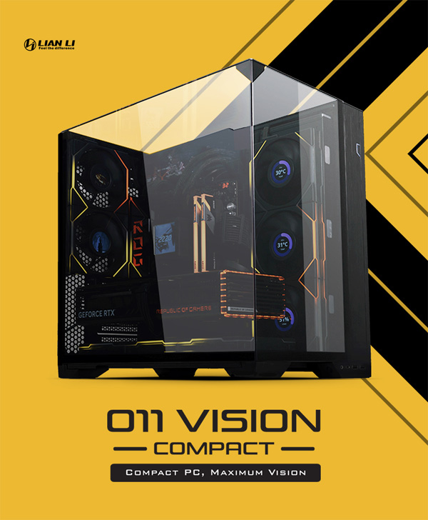 O11 시리즈는 다양한 파생 모델을 갖춘 리안리를 대표하는 PC케이스 제품이다. O11 비전은 이러한 파생 모델 중 하나로 3면이 강화유리로 되어 있는 독특한 구조로 소위 ‘어항형’이라 불리는 PC케이스에 유례없는 개방감을 제공하는 제품이다. 이번 O11 비전 컴팩트는 O11 비전의 규격 파생 모델로 더 작아진 크기에 새롭게 추가된 기능들을 담고 있다. 리안리는 O11 비전 컴팩트에 기본 강화유리 외에도 교체 가능한 메쉬(Mesh) 타입 상단 패널을 추가로 제공한다. 이를 이용하면 상단에 수냉 쿨링을 위한 라디에이터나 쿨링팬 설치가 가능한 추가 쿨링 환경 구성이 가능하다.